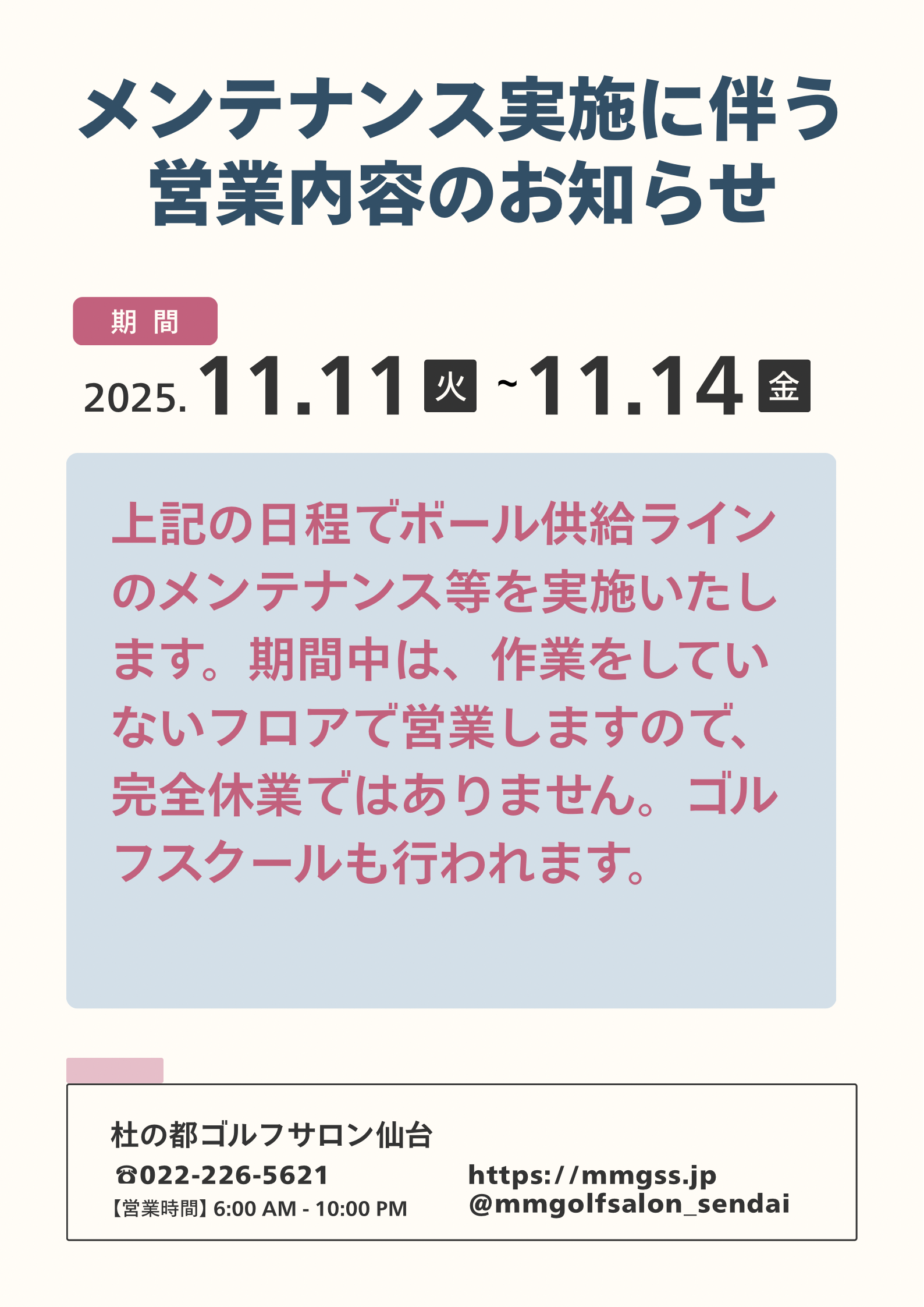 11月11日(火)から11月14日(金)までの4日間の日程でボール供給ラインのメンテナンスを実施いたします。