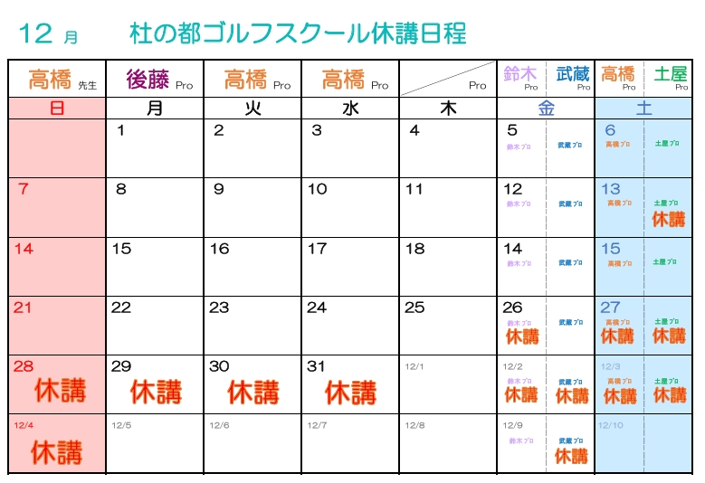 - 2025.12.17スクール1月度ゴルフスクールの休講日を公開しました。